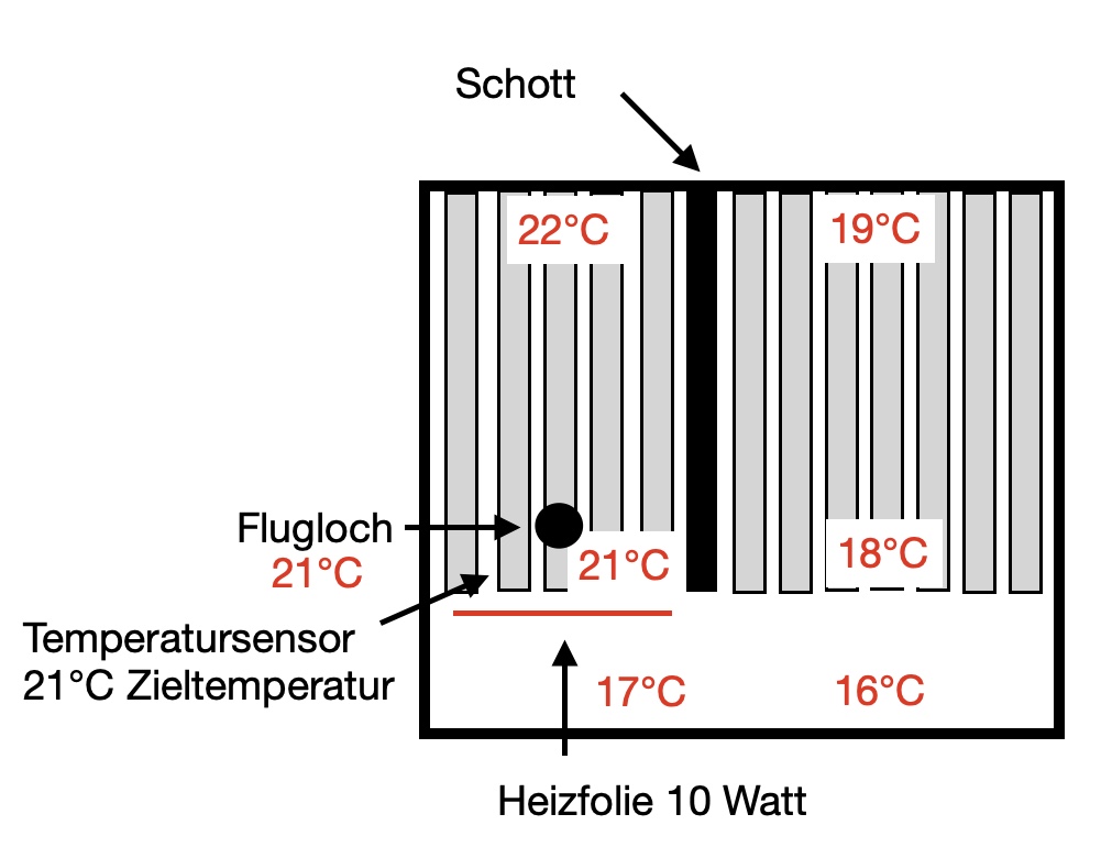 Der Volksaufbau im Frühjahr ist für Bienenvölker ein anstrengender Kraftakt, an dem sie nicht selten scheitern. Die Zieltemperatur im Brutnest beträgt 35 °C, während die Temperaturen draußen, vor allem nachts, immer wieder bis an den Gefrierpunkt fallen können. Eine Beutenheizung kann dem Bienenvolk einen Teil der Wärmeleistung abnehmen und die Brutnesttemperatur stabilisieren. In der gezeigten Konstellation schaltet sich die Heizung immer nur dann zu, wenn die Temperatur am Unterträger 21 °C unterschreitet. Dies ist die Temperaturschwelle, ab der Bienenvölker eine lockere Traube um das Brutnest bilden, um es ausreichend warm halten zu können. Durch die Wärmezufuhr simulieren wir stabilere Temperaturbedingungen, wie sie sich oft erst im Mai oder Juni einstellen. Das Ergebnis ist ein größeres Brutnest, eine beschleunigte Volksentwicklung und eine erheblich vergrößerte Bienenmasse zum Start der Frühtracht. Es ist absolut sinnvoll, beheizte Völker mit einer Wasserquelle im Stock und Pollenfutter zu unterstützen, um den vollen Effekt der Heizung nutzen zu können. Das Bild zeigt wie sich die Wärme in einem Stock mit ausgebauten Rähmchen und zugeschalteter Heizung verteilt. In allen Bereichen der Beute liegt der Taupunkt mindestens 2,5°C unter der tatsächliche gemessenen Temperatur der Stockluft. Die Heizung beschleunigt nicht nur die Volksentwicklung, sie verhindert auch effektiv Kondensation und resultierende Probleme mit Wabenschimmel.