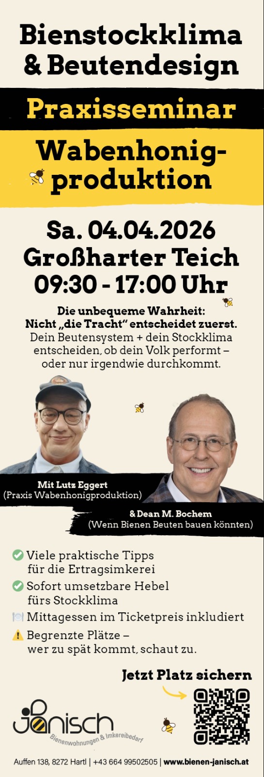 Wenn du besser verstehen möchtest, wie deine Beuten mit den Bienenvölkern interagieren – thermisch, energetisch und biologisch – lade ich dich ein, genau diesen Fragen gemeinsam nachzugehen. Begrenzte Teilnehmerzahl – Anmeldung erforderlich. Wir sehen uns bei Janisch in Hartl.